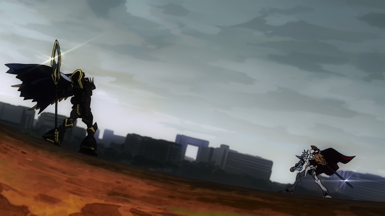 Alphamon 追蹤 Meicoomon(緬因貓獸)來到了現實世界 , 但被同為皇家騎士的 Omegamon(奧米加獸)阻撓着